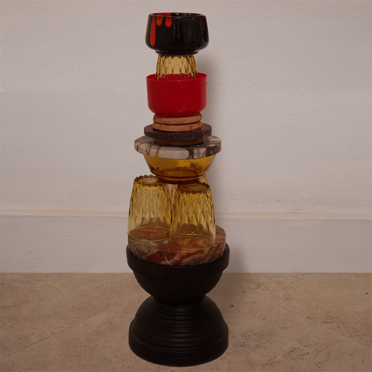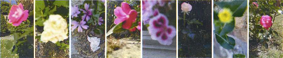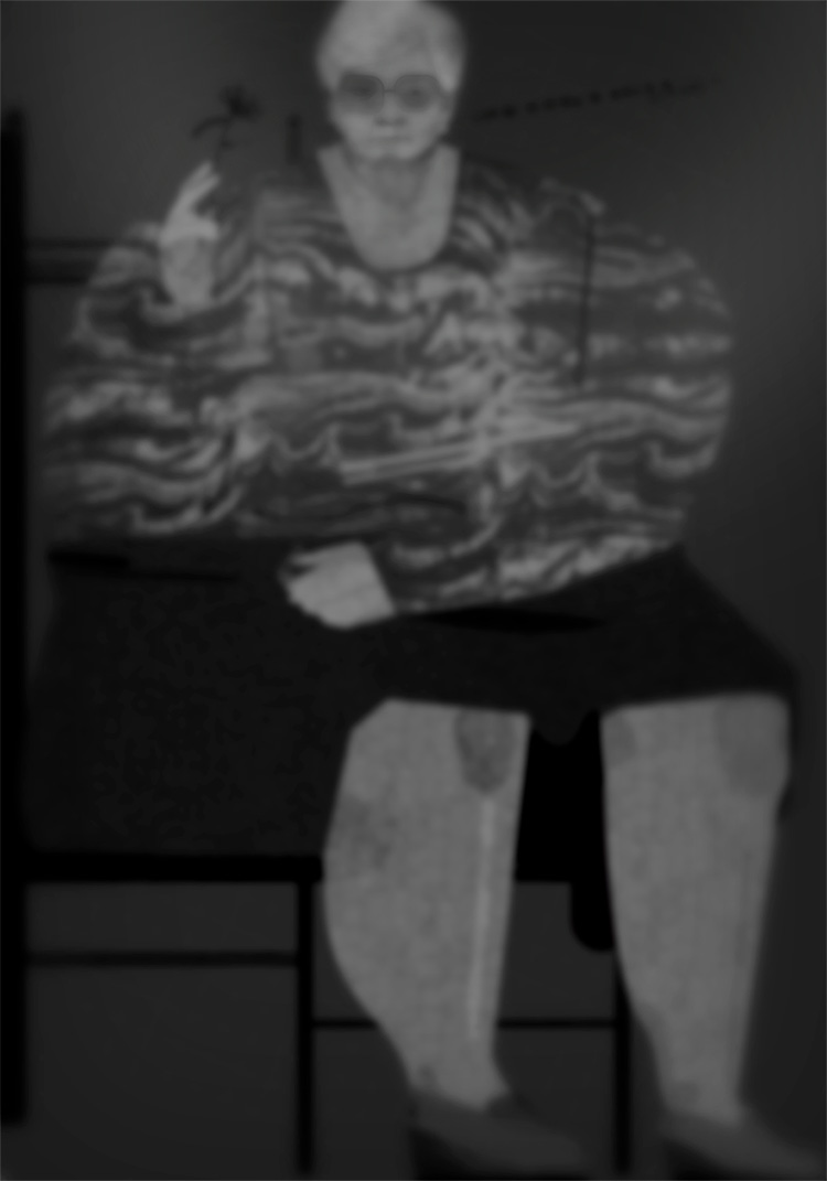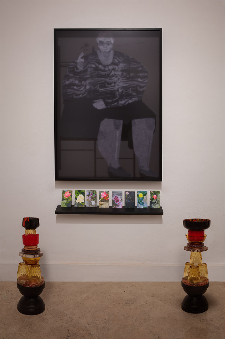 En mi trabajo me gusta investigar de qué manera la materialización de la imagen en un formato físico puede alterarla o complementarla, jugando con pliegues en el papel, reflejos, distorsiones… En este caso he utilizado el soporte del marco y el cristal para distorsionar una imagen perfectamente definida. Tiene que ver con la experiencia de mirar la ciudad a través la ventana, con la capacidad de entender la información, con la legibilidad, con los secretos y lo que no eres capaz de expresar con claridad. También es un altar para mi abuela. La pieza se completa con unas fotografías impresas en risografía y doradas con pan de oro en su reverso. Flores y velas al mismo tiempo.